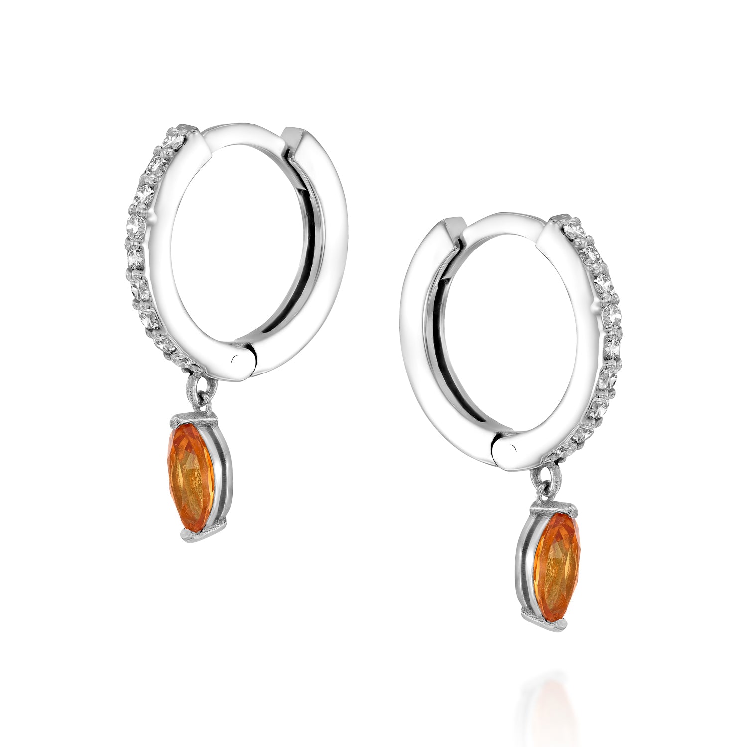 .מכל חישוק נתלה ספיר כתום בחיתוך מרקיזה, שמוסיף נגיעה צבעונית מלאת עומק וקסם