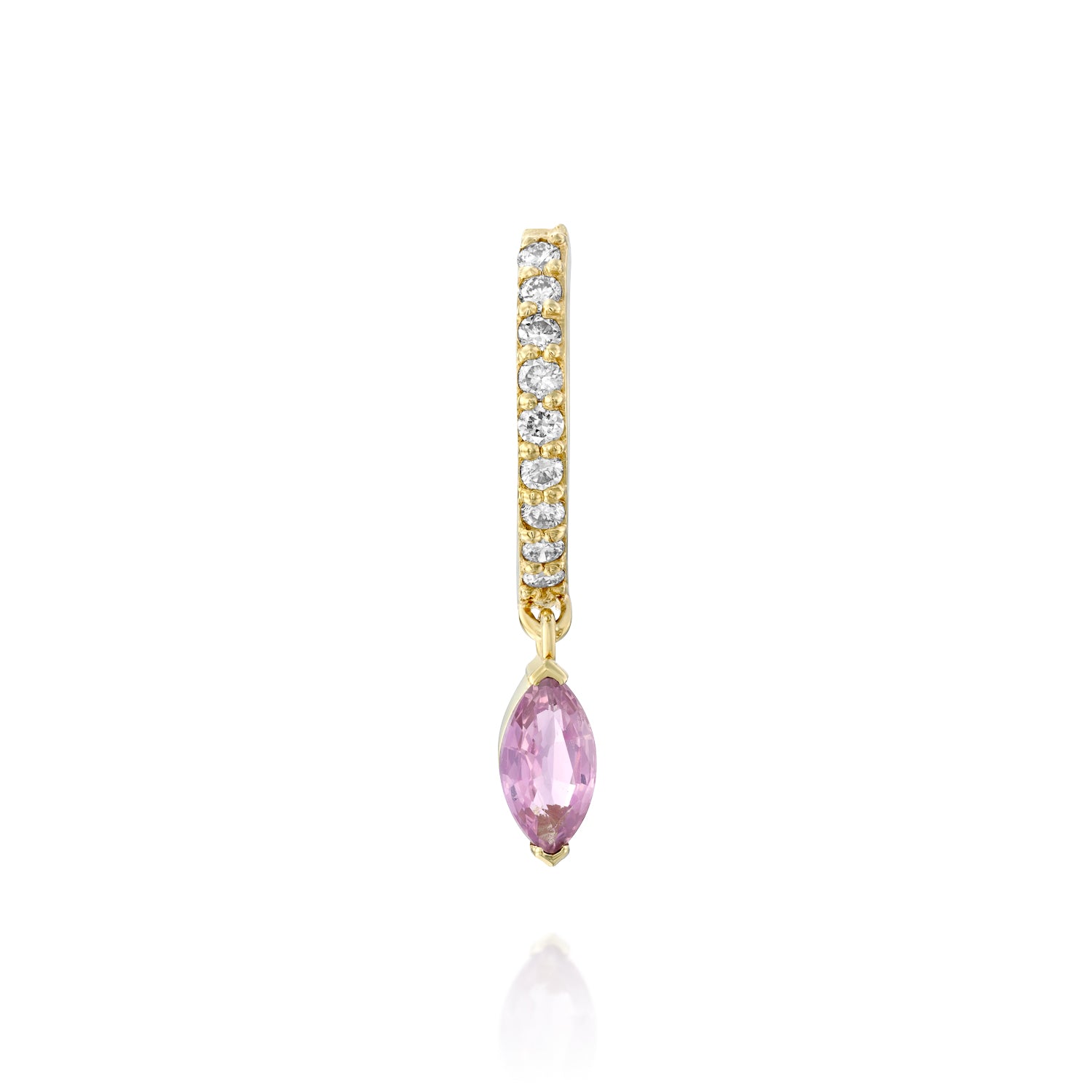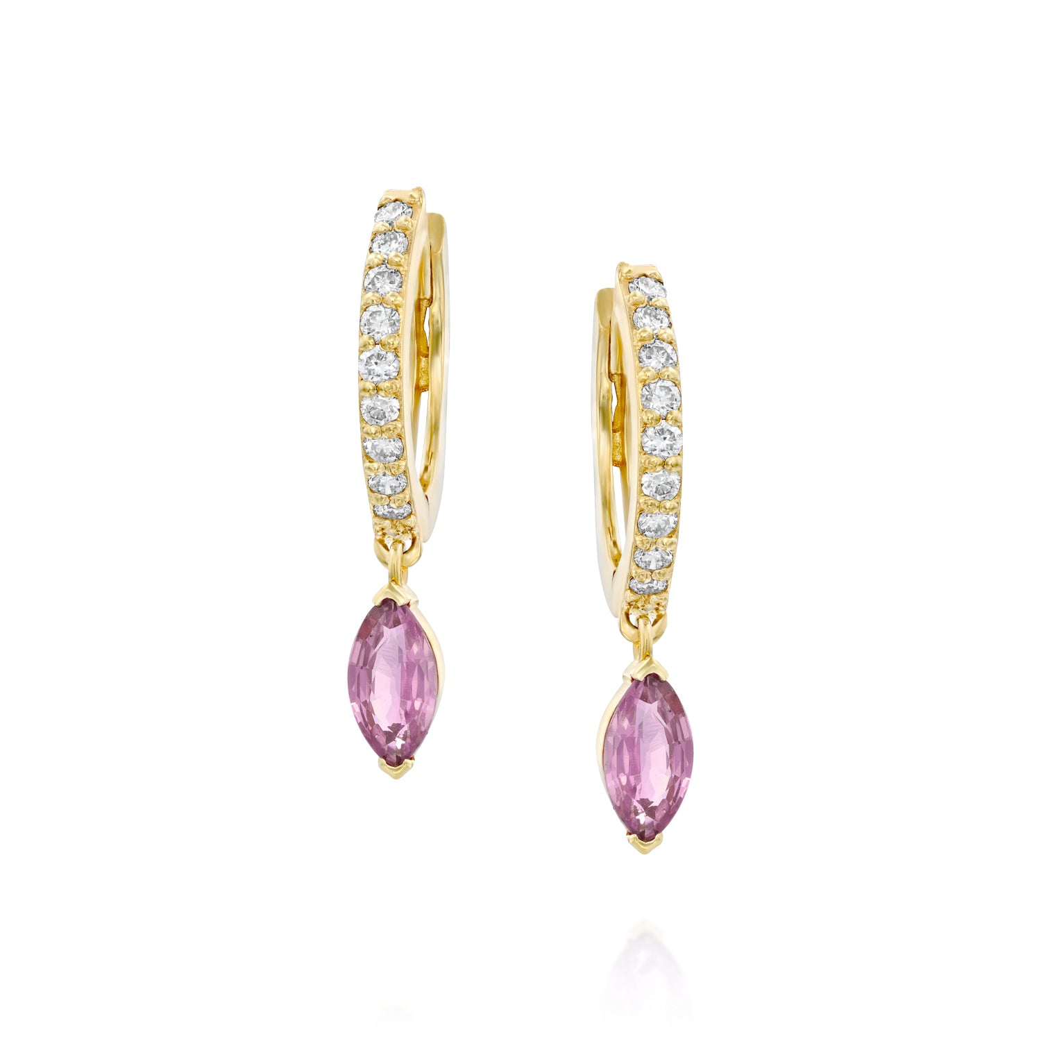 .מכל חישוק נתלה ספיר ורוד בחיתוך מרקיזה, שמוסיף נגיעה צבעונית מלאת עומק וקסם