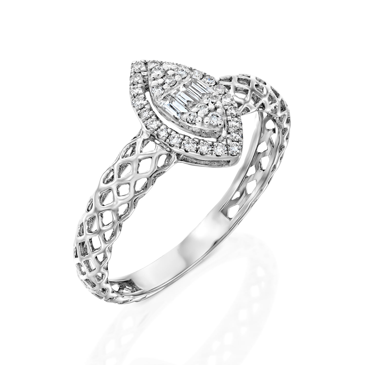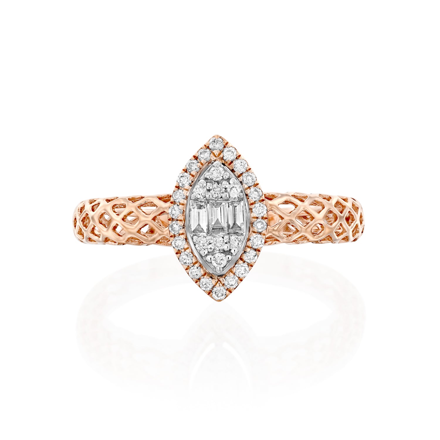 טבעת עם נוכחות יוצאת דופן – שילוב של יהלומים עגולים ויהלומים בחיתוך בגט שיוצרים מרקיזה,
